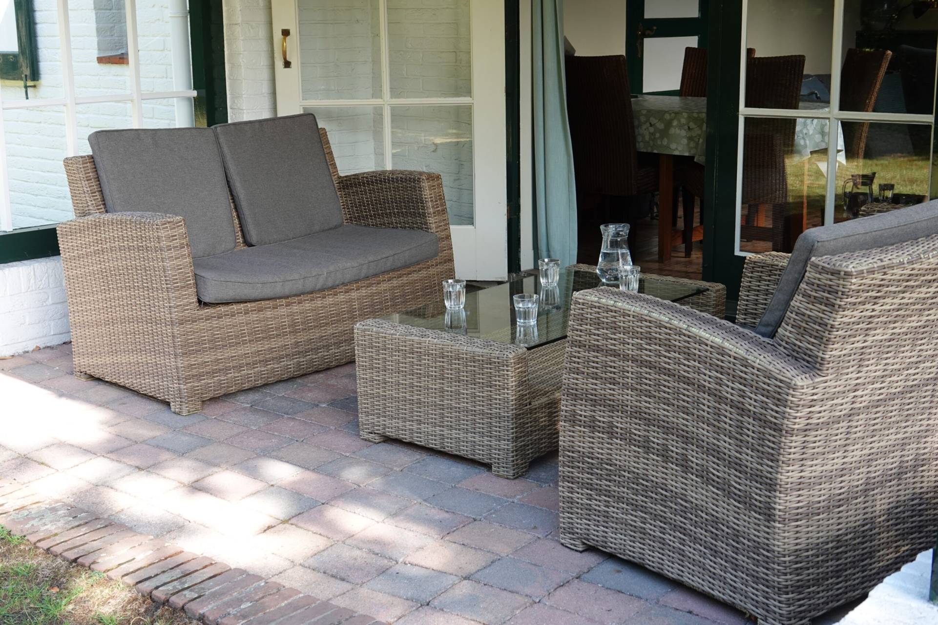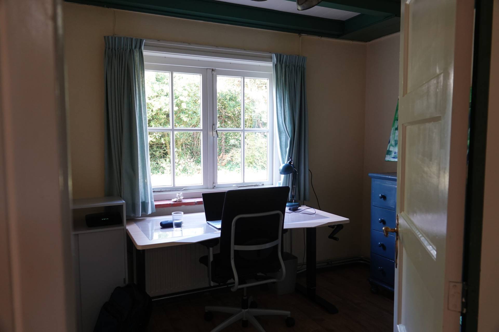 Beneden ligt de gezellige woonkamer met zithoek en televisie, waar je na een dag buiten heerlijk kunt bijkomen. De eettafel grenst aan een overdekte veranda: een fijne plek om samen te eten of nog even na te praten in de avondzon. Daarnaast is er een aparte werkkamer met een verstelbaar bureau en comfortabele bureaustoel, ideaal als je even rustig wilt lezen of werken. De moderne keuken is van alle gemakken voorzien: een koelkast met vriezer, vaatwasser en combi-magnetronoven. Ook de badkamer met douche en toilet bevindt zich op de begane grond. En natuurlijk is er in het hele huisje een snelle en stabiele WiFi-verbinding.